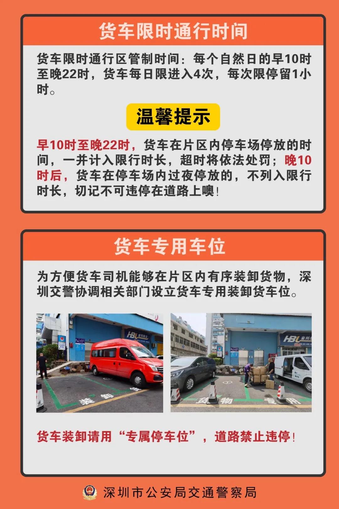 华强北“货车限时通行区”具体区域为上步路、深南大道、华富路、红荔路围合范围内所有道路(不含4条边界道路);具体时间为每个自然日的早10时至晚22时,货车每日限进入4次,每次限停留1小时;限行货车类型为所有类型货运车辆(含新能源货车),此外,货车在片区内停车场停放时间,一并计入限行时长,超时按规定进行处罚:处300元罚款,记3分。